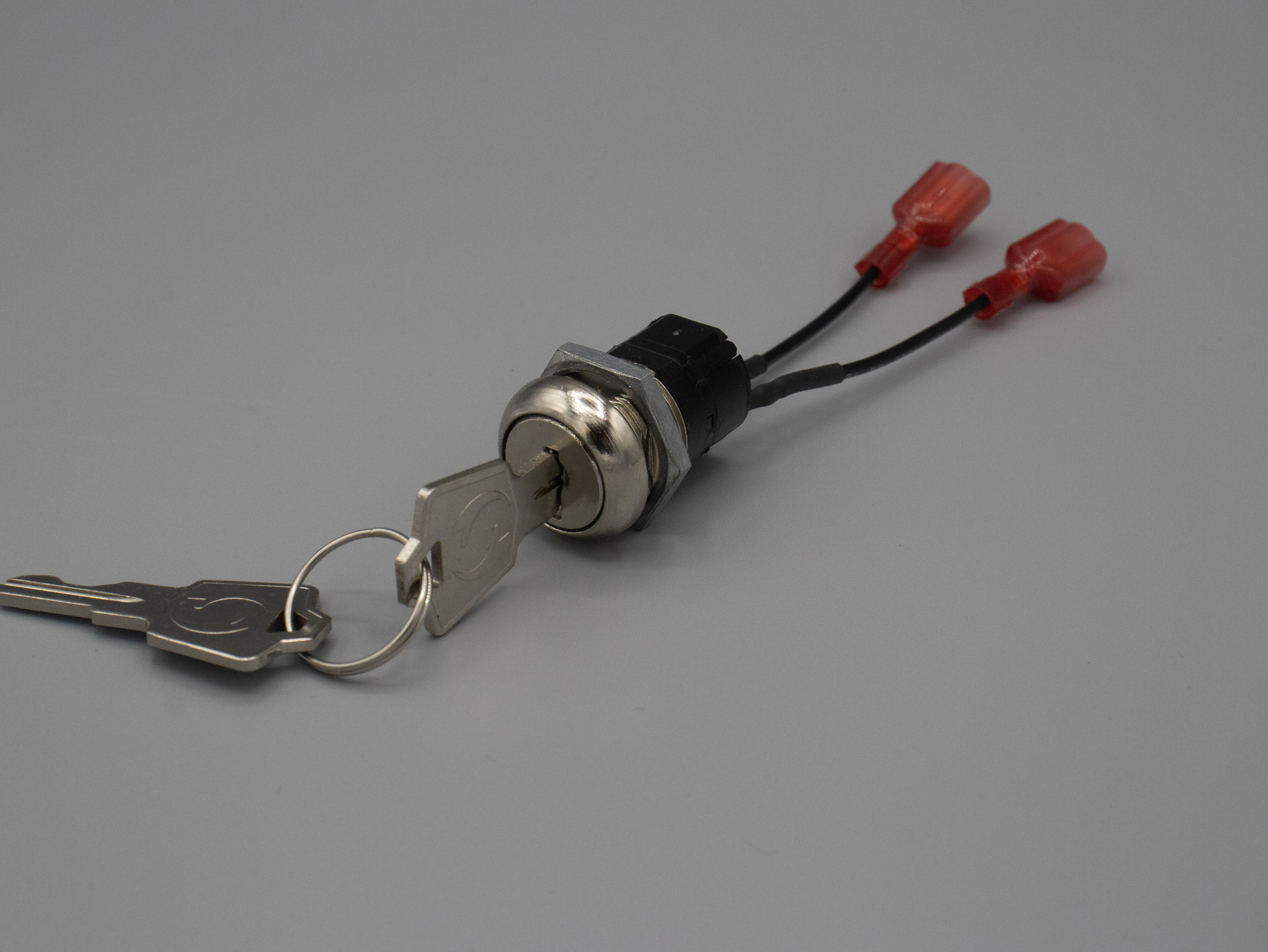 This switch provides a normally open or closed contact for a customer specific circuit which is capable of being locked in the on or off position with the removable key included in this assembly. RWIS soldered the two wires, added heat shrink to cover the soldered joint and added two customer specified terminals to this assembly.